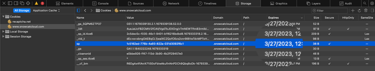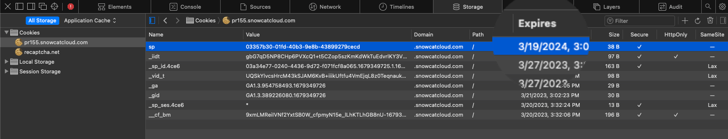 WITHOUT Cloudflare Worker (below) even though the domain is the same as the website (sp.snowcatcloud.com) the cookie is set to expire in 7 days (March 27th 2023).